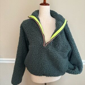 Express Fleece Pullover. Size XS, but this is oversized. Please see pictures for approximate measurements. Super soft and comfortable! The bright color on the inside of the zipper adds the perfect pop of color. Has pockets on both sides.