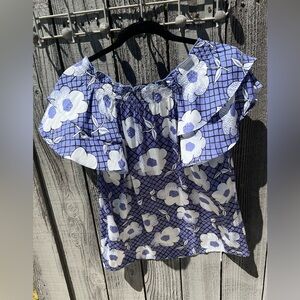 Stylish floral blouse with a blue and white pattern. Perfect for casual or dressy occasions. You can pair this cutie with your favorite jeans for a night out. Or you can wear it under a classy blazer or leather jacket. Size Medium. Pre-loved and in excellent condition.