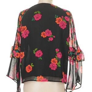 Chic blouse with vibrant pink and orange floral design. Sheer fabric with flowing sleeves. Ideal for stylish occasions.
