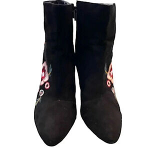 Express Floral Botanical Embroidered Heeled black faux suede ankle Booties, size 8