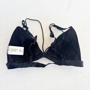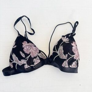 Elegant black bralette with floral embroidery. Features delicate straps and intricate design.