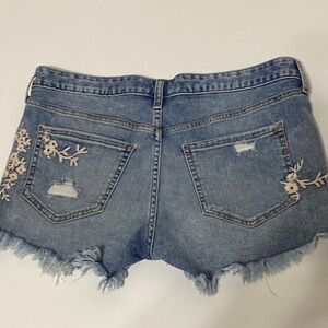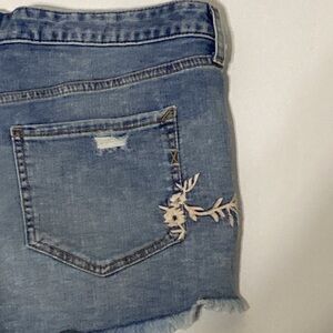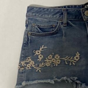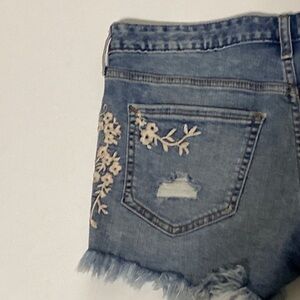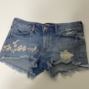 Express Floral Embroidered Light Wash Distressed Raw Hem Shortie Shorts