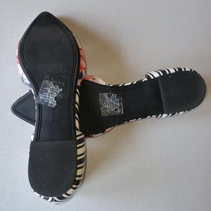 Comfortable flat shoes worn only a few times. Very lovely white and red flowers on dark blue background in front, with white and black stripes on the heels. Perfect summery look matching red, white, or blue handbag or summer dress. Almost no wear on soles.