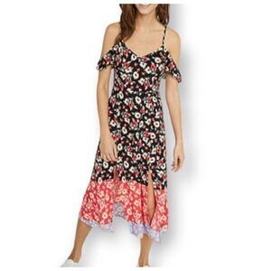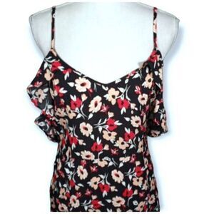 Stylish floral maxi dress. Features cold shoulder design. Vibrant red and black pattern. Perfect for any occasion.