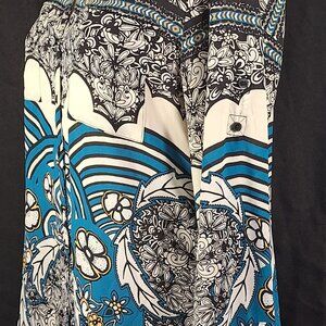 Stand out with this white and blue floral patterned Express Portofino Shirt for women in size medium. The blouse features a v-neck, button closure, polyester material, and a regular fit. It is lightweight, slimming, and packable, making it suitable for various occasions such as travel, school, work, parties, and more throughout all seasons.