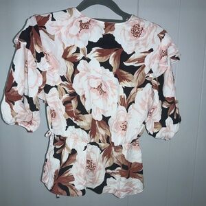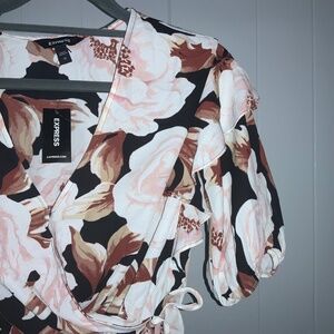 Express Floral Print Faux Wrap Puff Sleeve Peplum Top Sz XS New