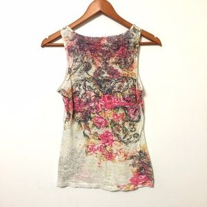 Bright colors and a romantic floral motif on this cute, casual top. Like new condition.