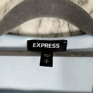 This is a stylish Express dress in size Small featuring a beautiful floral pattern and a flattering V-neckline. The dress has flutter sleeves and a twist front detail, adding a unique touch to its A-line silhouette. Made of polyester material, it is perfect for various occasions such as travel, weddings, parties, or casual outings during the summer and spring seasons. The dress is machine washable and comes in a lovely blue color, making it a versatile and chic addition to any woman's wardrobe.