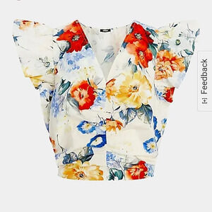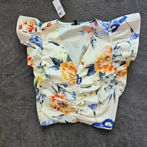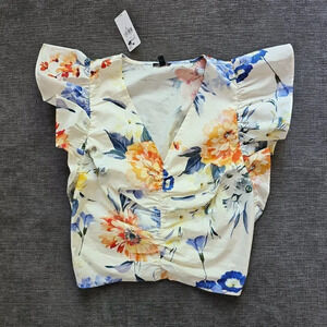 Express Floral V-Neck Flutter Sleeve Ruched Top Multi-Color For Women's Small