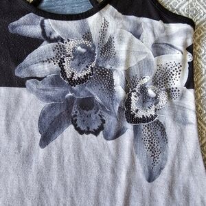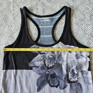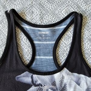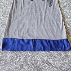 Racetrack Tank Dress. Front has rhinestone detailing on flowers and back is striped. Cobalt blue color-blocked bottom. Dress is thinner material. Can be worn with black leggings.