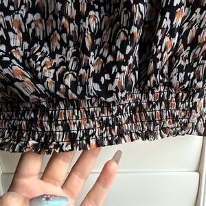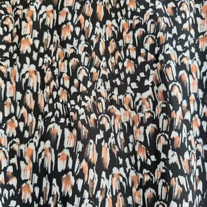 - Black background with a feather-inspired print in white and orange-y brown tan