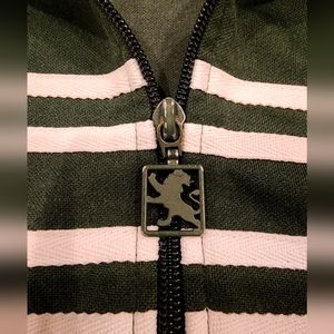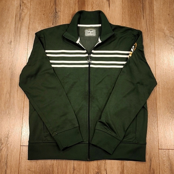 Details: Dark green with white stripes on the chest. Signature Zipper. Signature Crest on left shoulder chest pocket. Ribbed collar, cuffs, and waist.