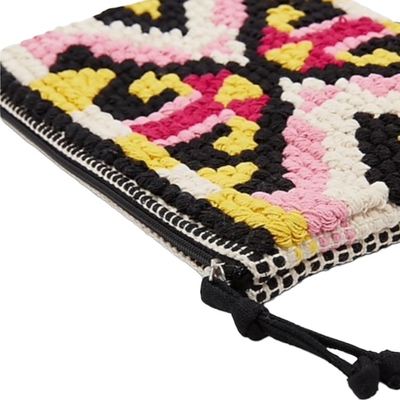 Express multi-color geometric design cotton pouch with a zip top closure. This pouch is the perfect size for carrying your necessities on those warm weather nights, vacations or cruises. Would make the perfect cosmetic bag. Has one interior pocket.