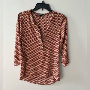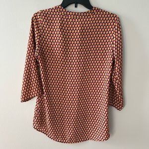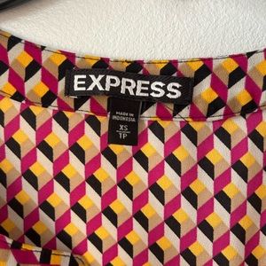 Geometric pattern is pink, yellow, and black. It also has a silver zipper to adjust how low the dip is