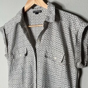 Express Geometric Print Button Front Shirt Dress, featuring front pockets. Lightweight and unlined, hidden buttons down the front, knee length.