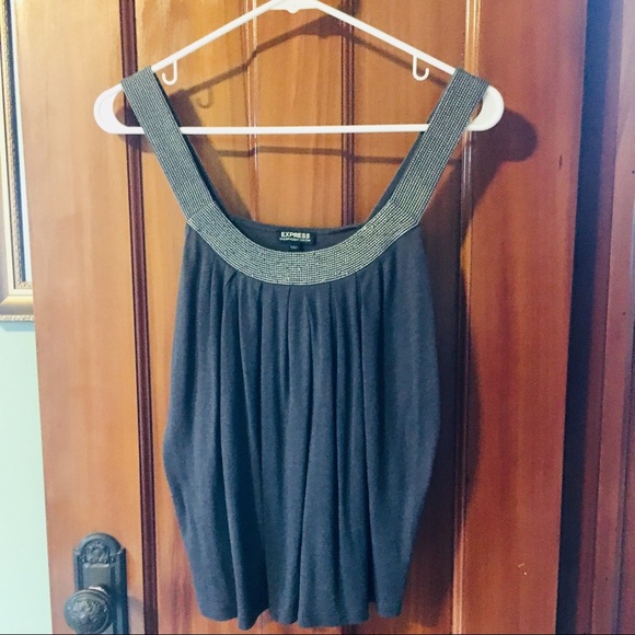 Flowy blue cotton tank from Express with silver glitter-thread detail at neck and straps. Looks great alone or under a jacket or cardigan. Size XS. Excellent condition.