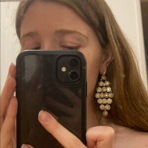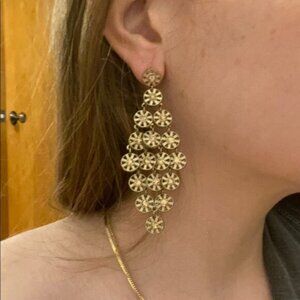 These stunning gold earrings from Express feature a sophisticated chandelier design with a cascading arrangement of circular elements. The intricate openwork pattern creates a delicate yet bold statement, perfect for adding a touch of elegance to any ensemble.