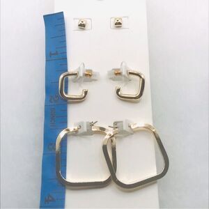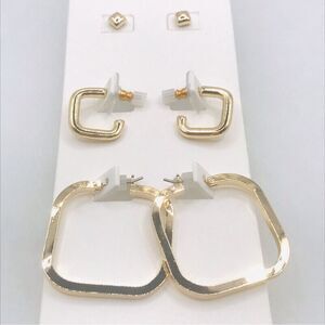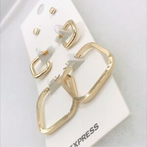 Name brand fashion accessory Elevate your style with the Express Gold Earring Set. This elegant collection features three pairs of gold earrings hoops and stud, perfect for any occasion. Add a touch of sophistication to your look with these versatile pieces, new with tags, see pictures for measurements.