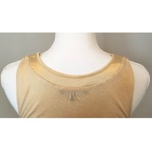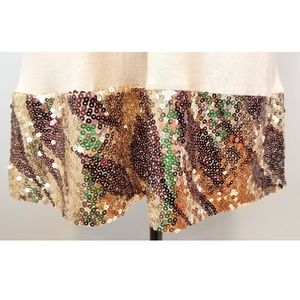 Like-new condition. Be glitzy and comfortable at the same time! Gold and brown sequins in a zebra print embellish this simple, flowy dress that's amazingly comfortable. The back collar and inside of POCKETS are lined with a satin-like material. Phone in 7th picture is just for show to demonstrate pockets, which are actually pretty deep (phone can fit all the way inside with room to spare).