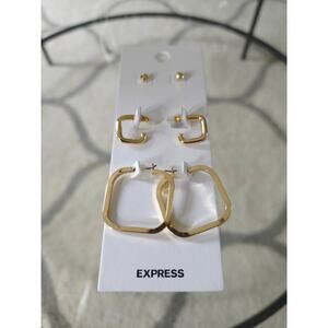 Brand new with tags, Express Gold Square Hoop Earrings New. Trio of earrings, 1 pair studs, 1 small square set of hoops, 1 larger square set of hoops
