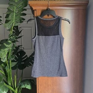 Express sleeveless blouse in grey with black lace at chest and shoulders. sweetheart neckline and fitted design. excellent condition. seeing no flaws.