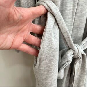 Express Gray Cozy Stretch Jersey Knit Belted Puff Sleeve Lounge Jumpsuit XL. This is so soft and comfortable!love the extra special sleeves and it does have pockets. The inside has a cozy fleece feel. it is new but I noticed one of the belt loops is stretched out a little but doesn’t affect wear and a belt got caught in some things so there are some holes and stains-see last photos