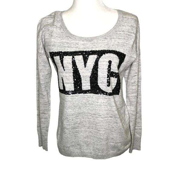 Express Gray Heather Sweater with Black NYC in sparkly Sequins. 100% soft cotton. Scoop neck. Size Small. EUC.
