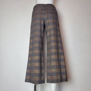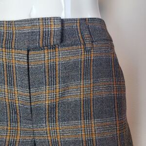 Express "Editor Relaxed Trouser Mid Rise" gray, black, dark orange, and gold metallic plaid cropped wide leg trousers. Mid-rise with 2 hooks/button/zipper closure, 2 slanted hip pockets, 2 back trouser pockets, and inner lining.