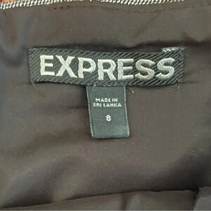 Express Gray Pencil Skirt with Back Pleated Slit, zips at back and has hook & eye clasp, shell is 61%Polyester 34%Viscose %5Elastane, lining is 95% Polyester 5%Spandex, size 8.
