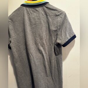 Gray polo with colorful striped collar. Features a subtle logo on the chest. Ideal for casual wear.