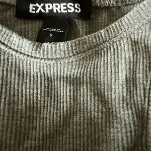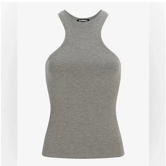 Slim ribbed tank with a racerback high neckline. Stretch knit fabric for a snug fit. Clean, minimalist look for layering or solo wear. Neutral gray pairs easily with many outfits.