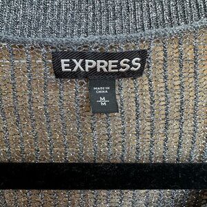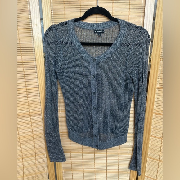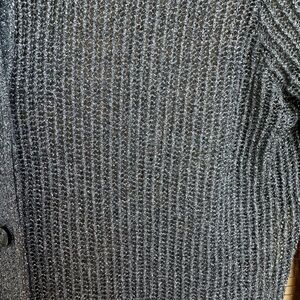 Stylish gray ribbed sweater. V-neck with button front. Long sleeves. Perfect for layering.