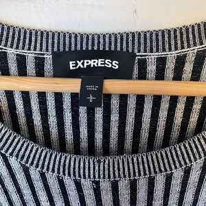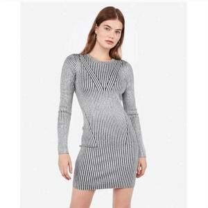 Silver heather gray. ribbed striped sweater. Crew neckline with long sleeves. Straight hemline. Slimming fit, stretchy. Rayon material. Hits above the knee.