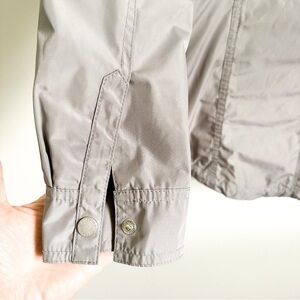 Express Gray Zip Up Anorak Windbreaker Rain Jacket. Size Small. Excellent condition. Maybe worn twice. Elastic bands at sides for stretch. Drawstring at bottom hem. Two front pockets. Zip and snap button closure at front. Single snap buttons at cuff. Lightweight.