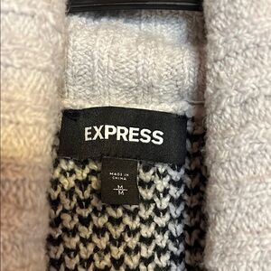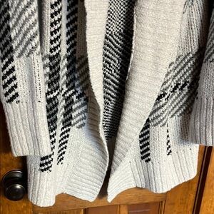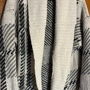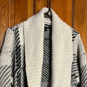 This Express cardigan sweater features a striking geometric pattern in gray and black, offering a bold and stylish look. The open front design with a shawl collar adds a touch of elegance, while the thick knit material ensures warmth and comfort. Perfect for layering, this mid-thigh length cardigan is a versatile addition to any wardrobe.