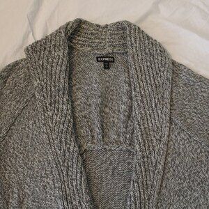 Express brand. Short sleeved, open front, cardigan sweater. Rolled collar and rounded bottom hem. Variegated yarn in medium/light gray and white. Size Medium.