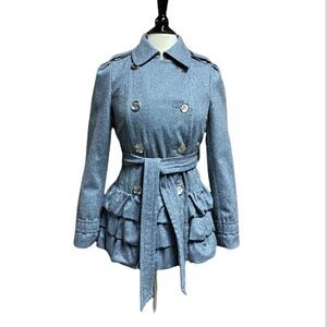 Express Gray Wool Double Breasted Ruffled Belted PeaCoat Size XS NWT