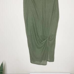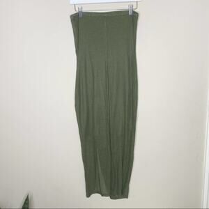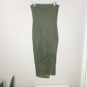 Dark green ribbed stretch midi dress. Strapless. Lined to knees. Sheer at bottom.