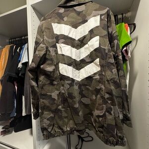 This Express military field jacket combines rugged durability with a stylish green and brown color palette. Crafted for outdoor adventures, it features a medium to heavy weight material ideal for tactical use. The design is inspired by classic military wear, offering both functionality and a timeless look.