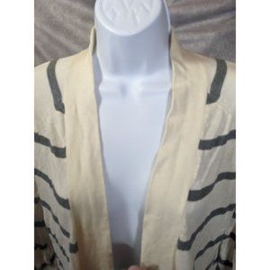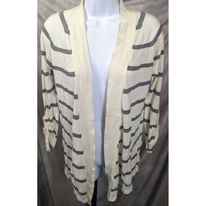Trendy and casual grey and white striped cardigan by Express. It's soft, and flowy. It's in a white that's just a tad shy of eggshell. It has thin grey accent stripes. It has wide trim around the opening and neckline. The sleeves have buttons and fabric loops so that you can wear the sleeves long or at elbow length. There is a small hole in the back next to a seem, a little smaller than a pencil eraser. See photos. Great for cool weather, and lounging!