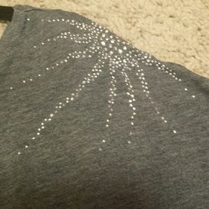 Grey T-shirt with rhinestone starburst on shoulder. Long in length