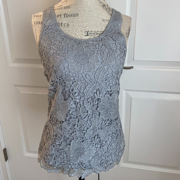 This Express grey tank is beautiful and elegant. The lace is made out of a shimmery grey material and there is a solid base underneath. It is very comfortable and soft on the inside. There are no rips/stains and it comes from a smoke free home.