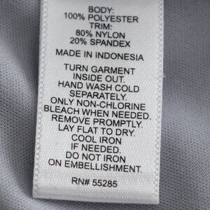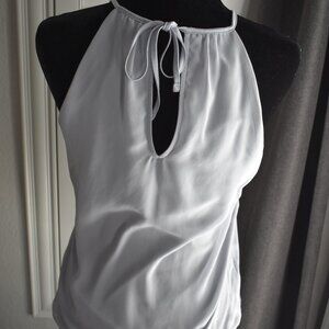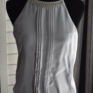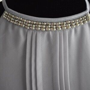 Like New. Only warn a handful of times. Light blue blouse has pearls and rhinestone around the top tie in the back of neck. Has a keyhole in back on top. The bottom is cinched all around.