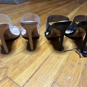 Clear straps, not much stretch. Only worn to try on so like new. Have been stored so aside from dusting off needed they’re in good shape! Also have a black pair up for grabs. I normally wear a 9 and went up a half size for space!