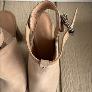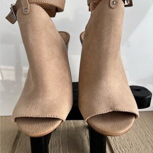 Express High Heels Women’s 8 Platform Slingback Peep Toe Buckle Beige Fabric