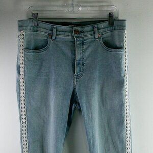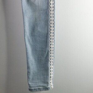 Style: Light Wash, Crochet Lace down sides, High Rise Ankle Legging
