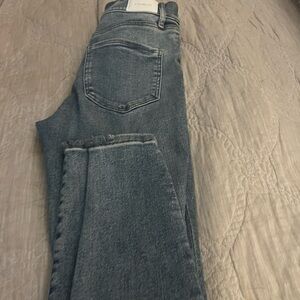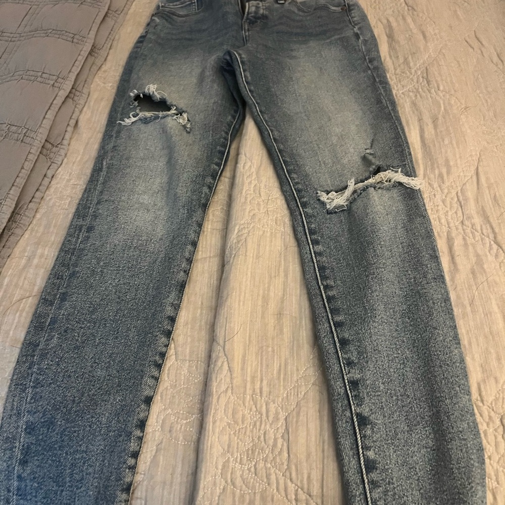 Trendy high rise jeans with stylish distressing. Ideal for everyday wear.