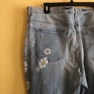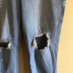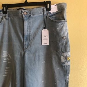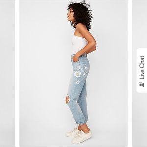 “Our laid-back, relaxed girlfriend jean with a retro-cool high waist and a little extra sparkle. Destruction at the knees gives them an edge, while the cotton blend stands up to your busy lifestyle.” *from Express site