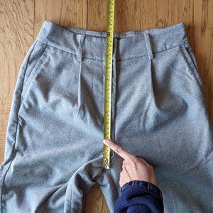This is a pair of high rise wool-like gray ankle pants with lining in good condition. The high-rise trousers feature a pleated front and a tapered leg style, making them perfect for both casual and business occasions. I consider them regular length for petites, but they're meant to be ankle pants for "regular" heights. These are lightweight yet warm and perfect year round. Would look great in a business and academia wardrobe.