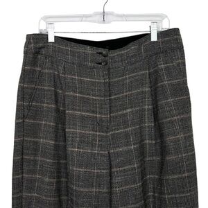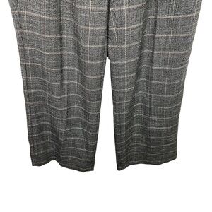 Black and white (but blends to gray) check / plaid trouser / dress pants with a bronze metallic thread woven throughout. Have a button and zip closure. Preowned. Have minimal pilling but otherwise in good shape.